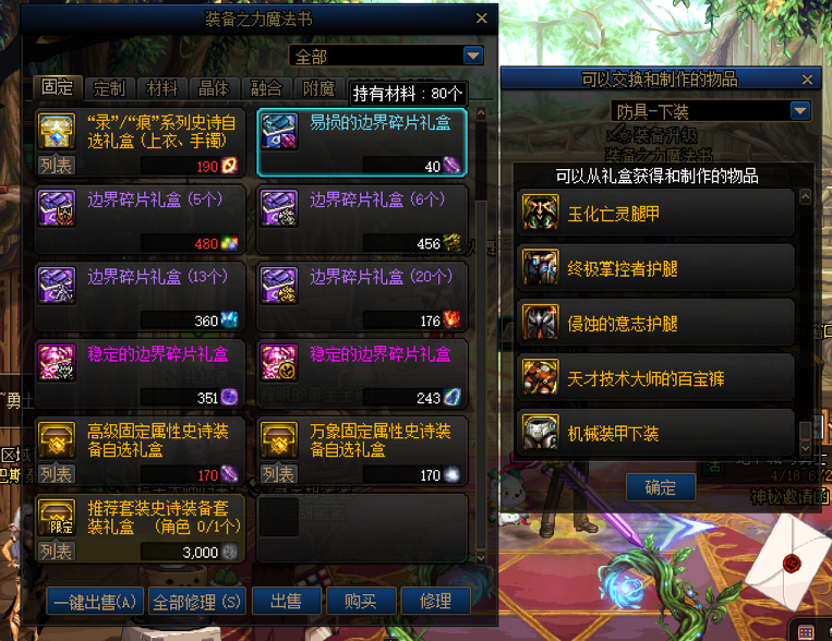 另外2件固定史诗装备,赛博朋克长靴(攻速鞋)和机械装甲下装则可以用稀薄迷雾在装备之力魔法书出兑换万象固定属性史诗装备自选礼盒,从中选择获得。