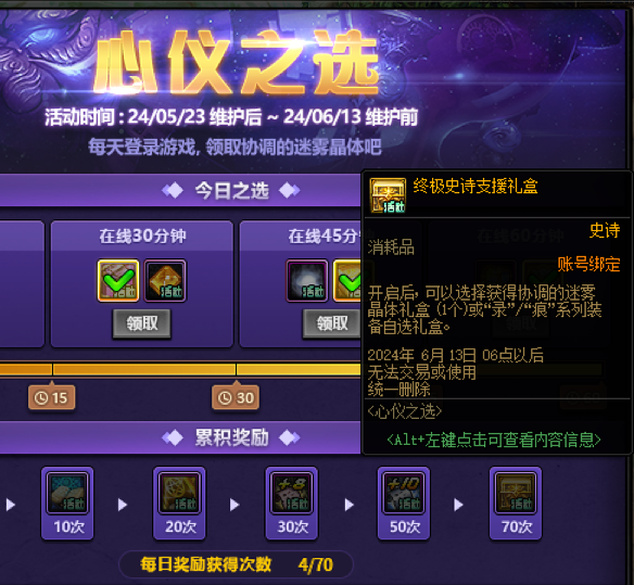 在新出的心仪之选活动中,勇士们累积获得70次每日奖励,也可以获得1个终极史诗支援礼盒。