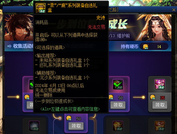 若勇士们参与本次的升级活动,为了避免浪费活动中获得的“录”/“痕”系列装备自选礼盒,则可以考虑项链、戒指、特殊装备用“录”/“痕”系列装备。通过升级活动的成长之路部分,勇士们一共可以获得3个“录”/“痕”系列装备自选礼盒。