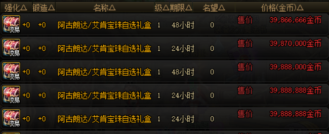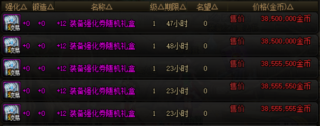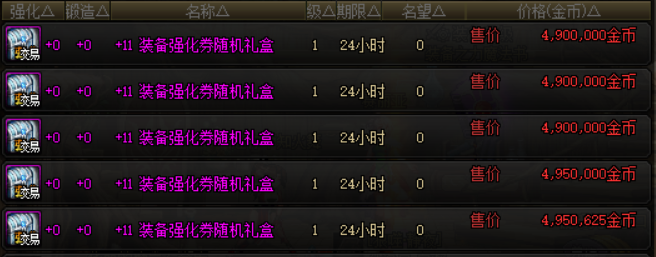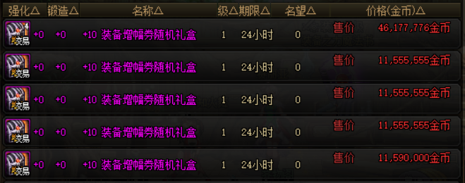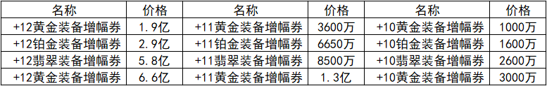 增幅券部分,+12装备增幅券随机礼盒的价格为2.4亿,打开之后可以获得成功率为30%、50%、70%、90%的+12装备增幅券。+11装备增幅券随机礼盒的价格为4300万左右,+10装备增幅券随机礼盒的价格在1100万左右。
