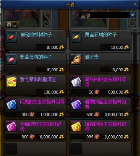 另一个就是婚戒属性了,需要在云清的商店当中购买戒指升级券,选择普通婚礼的话,初始获得的为简约的铂金戒指。使用心意点和金币即可购买戒指升级券,达到闪亮的白玉戒指即可获得婚戒的关键属性,后续仅为一些三速和暴击率的提升,性价比并不高。