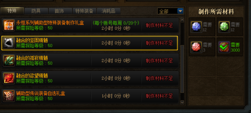 制作部分,推荐优先制作防具,然后才是首饰和特殊装备。因为专属装备防具要的材料是最少的,培养出来也会最方便。