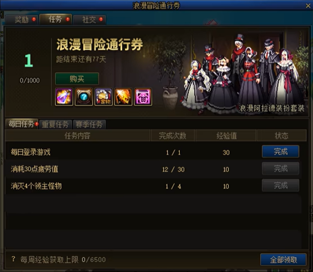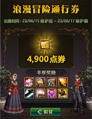 勇士们可以在商城当中以4900点券的价格购买浪漫冒险通行券,进阶通行券以解锁追加奖励的获取资格。