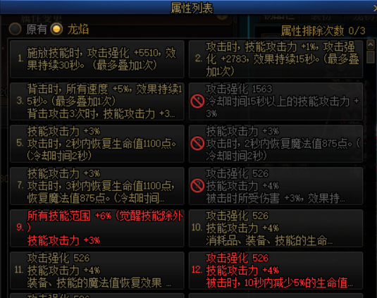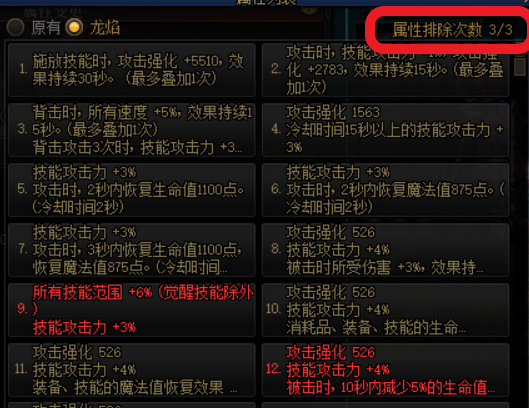 龙焰词条的词条库与巴卡尔融合属性的词条库共享,也就是说不会随机出现已有的词条,再加上每随机一次可以排除一个词条,以达成保底自选词条。