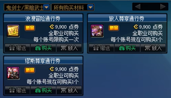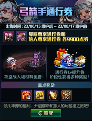 活动期间可以在商城当中使用点券购买弓箭手的专属战令,这里要注意只能使用点券,不可以使用代币券,弓箭手的两个转职旅人和缪斯分别可以购买一个自己职业专属的通行证,售价为9900点券。