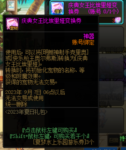 随礼包赠送的宠物只能当作过渡宠物使用,但是使用3张夏梦水上乐园游乐券即可兑换一张庆典女王比埃里娅转换券,可以将夏日礼包宠物升级,升级后的宠物属性与2023新春礼包的宠物属性一致,错过了2023新春礼包的小伙伴可以利用这次机会快速追赶进度。