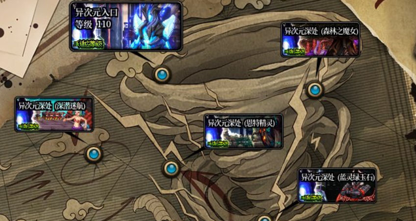 异次元深处系列地下城的名称上附带了副本可掉落定制属性史诗的名称种类,这四个副本进入需要消耗8点疲劳值,通关后固定获得5个未知的异次元碎片,随机获得与副本名称对应的定制属性史诗,词条等级在50~65之间确定,四个副本单角色每日共计可以入场4次。