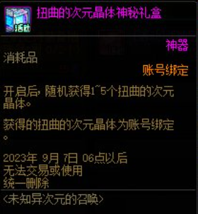 扭曲的次元晶体神秘礼盒兑换需要消耗70个未知的异次元碎片,打开之后可以随机获得1~5个扭曲的次元晶体,每个账号每周可以兑换三个,使用之后可以刷新目标定制属性史诗装备上的四个词条。