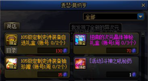 勇士们在副本当中获取到未知的异次元碎片可以在麦瑟·莫纳亨商店当中兑换奖励,奖励主要包括定制属性史诗自选礼盒、扭曲的次元晶体神秘礼盒和定制属性史诗装备袖珍罐。