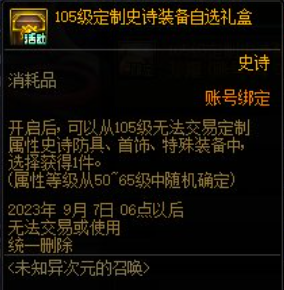 定制属性史诗自选礼盒兑换需要消耗130个未知的异次元碎片,每个账号可以兑换两个,打开之后可以在四个系列的定制属性史诗装备当中选择一件获得。