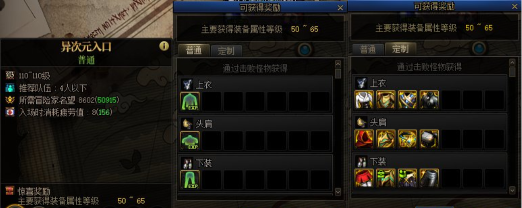 异次元入口没有入场次数限制,每次入场需要消耗8点疲劳值,通关可以固定获得1个未知的异次元碎片,并通关后随机获得定制属性史诗或者共鸣灵力史诗装备,词条等级在50~65之间确定。