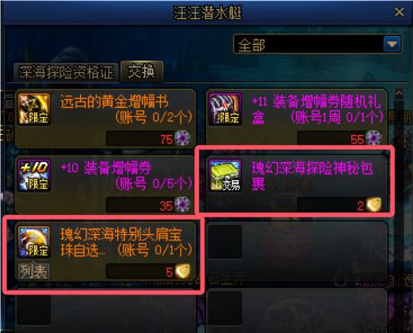 若小伙伴们不想在奖池当中抽取道具,可以在汪汪潜水艇商店当中兑换奖励。2个抽奖券可以兑换一个瑰幻深海探险神秘包裹,5个抽奖券可以兑换一个瑰幻深海头肩奇迹宝珠自选礼盒(任选1个),前者不限次数,而后者只能兑换一次。