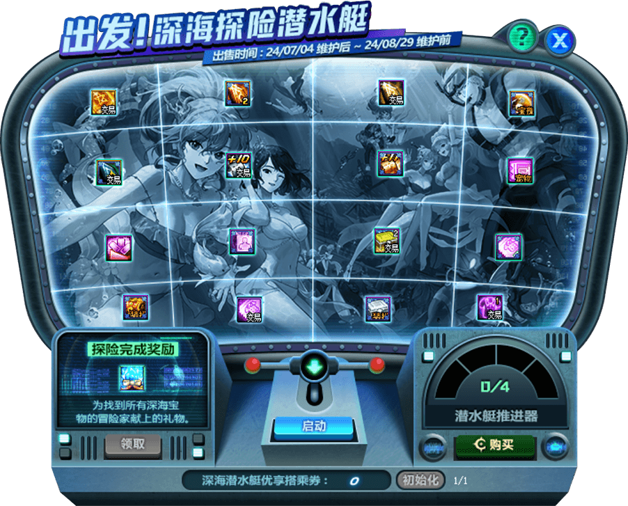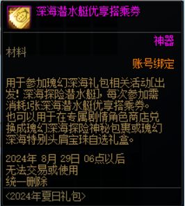 每一套夏日礼包包含两张深海潜水艇优享搭乘券,可以在深海探险潜水艇中抽取奖励。奖池采用不放回式抽奖,共包含16件奖励,购买8套可以搬空道具。