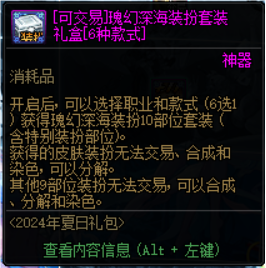 本次夏日礼包唯一可交易的装扮礼包,除了基础的四种颜色以外,特殊两种款式也包含在内,道具可交易,有喜欢的小伙伴也可以通过拍卖行入手。