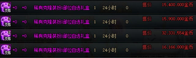 打开可自选一件稀有克隆装扮,可交易1次。拍卖行价格1600w左右。