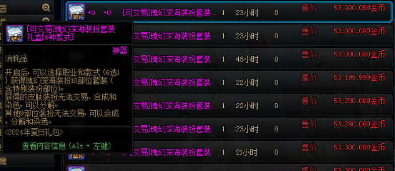 该夏日装扮礼盒可从6款颜色中选择,而且不限交易次数,没有删除期限。目前拍卖价格也很高,5300w金币一个,用于收藏也是不错的选择之一。