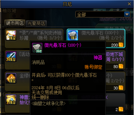 200个幽碧硬币可以兑换100个微光悬浮石,账号限制兑换两次。