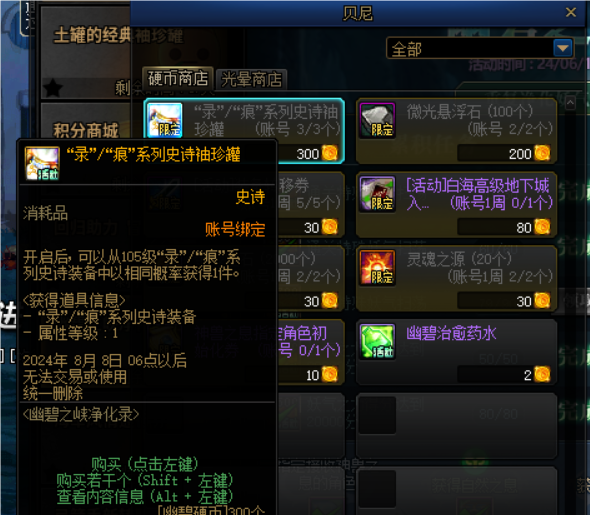 获得的幽碧硬币可在活动商店兑换等效四词条史诗袖珍罐,账号限制兑换三次。