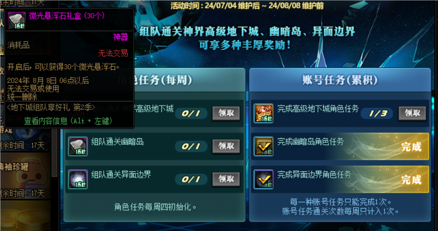 每周组队通关幽暗岛可以获得每周任务奖励,包含30个微光悬浮石。