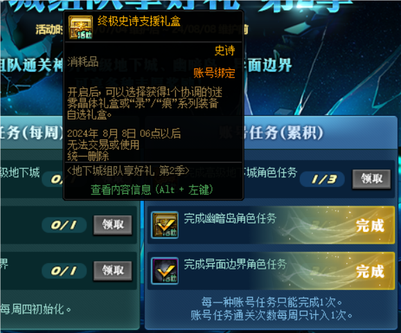 每周组队通关一次幽暗岛可以完成每周任务,累积完成三次每周任务即可领取一个终极史诗支援礼盒。需注意,没开始的小伙伴若错过本周将无法拿到最终奖励。