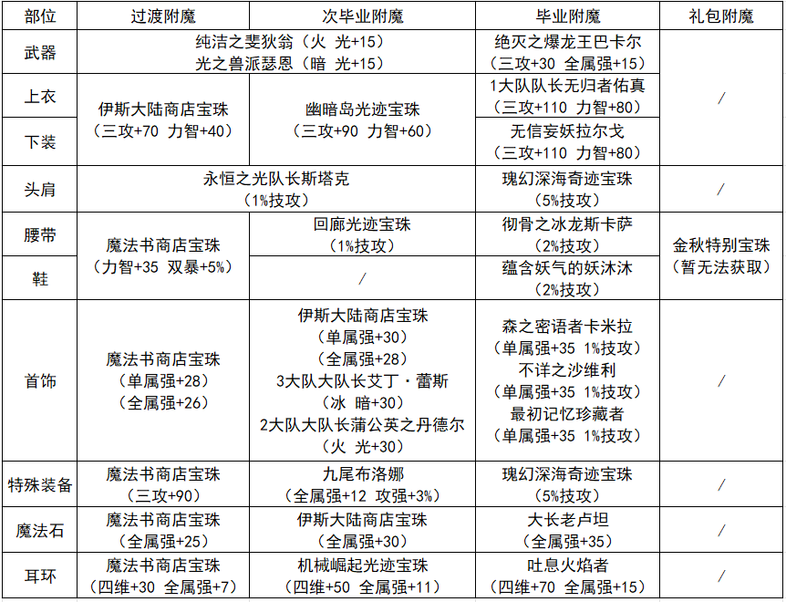 最后笔者将现阶段所有部位的毕业附魔列举在下方,没有提到的部分卡片价格较为昂贵,小伙伴们慢慢完善就好。