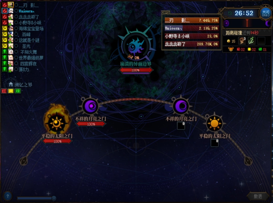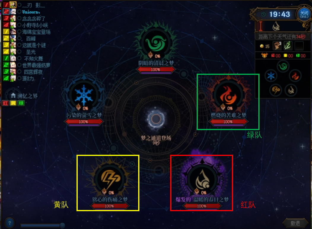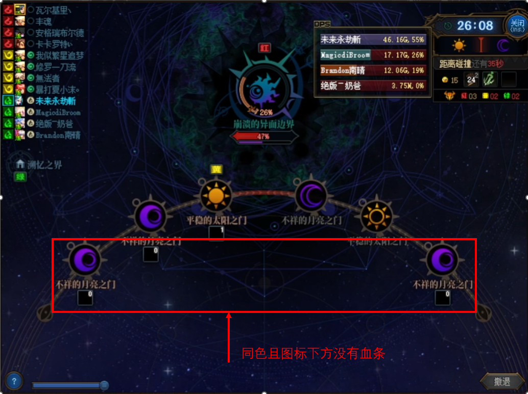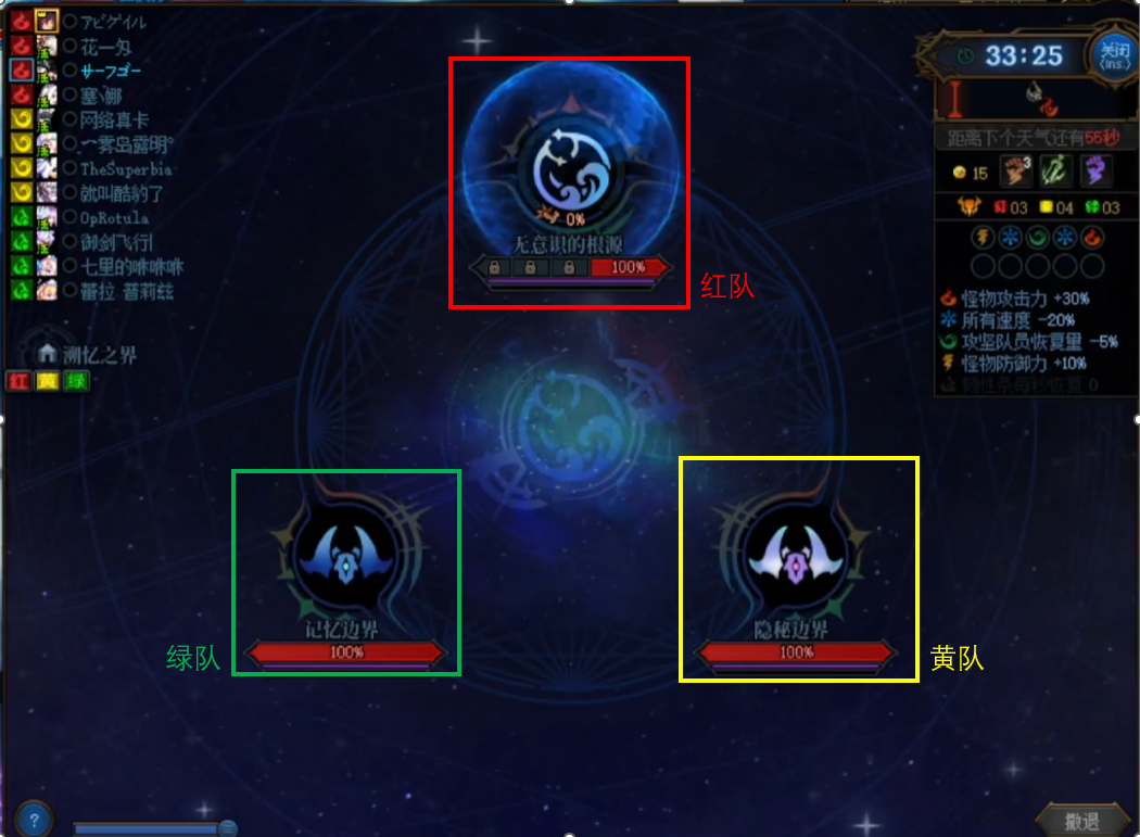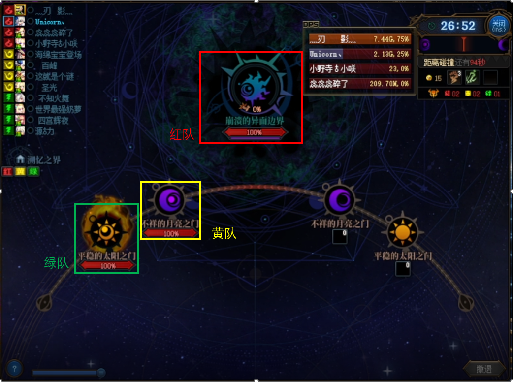 此时红队需要直接前往崩溃的异面边界,而黄、绿队则需要进入图标下面有血条的boss房间。