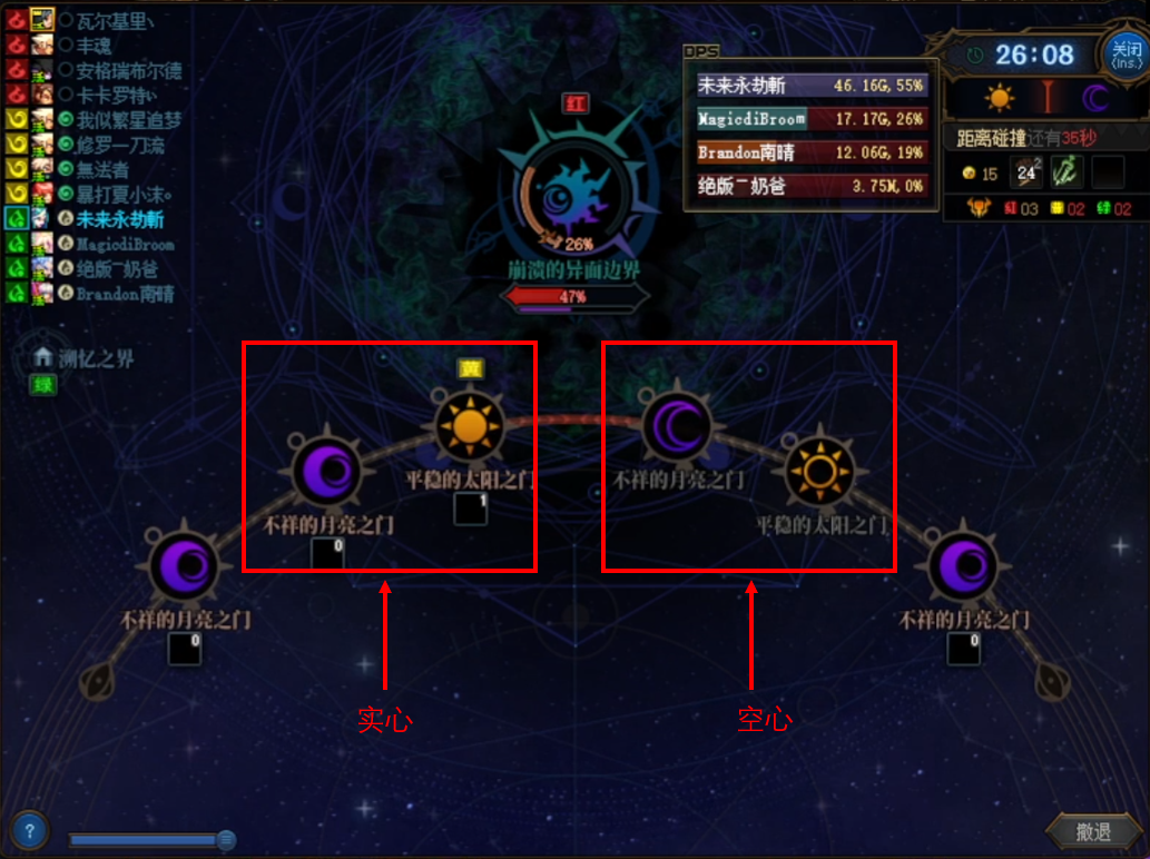 当在实心地下城获取三次增伤buff后会转变为空心,增伤buff会在每次日月碰撞时转递给崩溃的异面边界地下城。