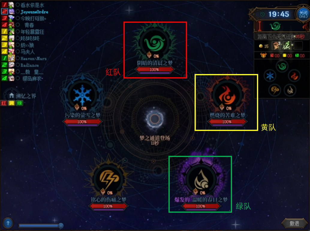 通常情况下,由红队进入无意识的根源地下城,黄队进入隐秘边界地下城,绿队进入记忆边界地下城。