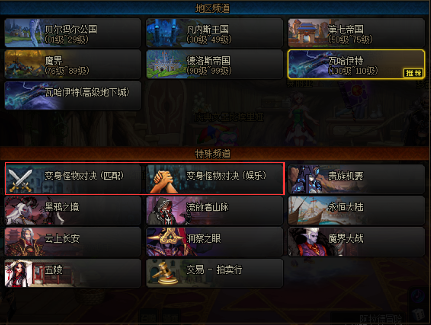 活动频道包含变身怪物对决(匹配)和变身怪物对决(娱乐),其中匹配模式下为随机组队,而娱乐模式下,勇士们可以喊自己的小伙伴来一起参与对决。勇士们想要获得活动奖励的话,选择进入匹配频道即可。