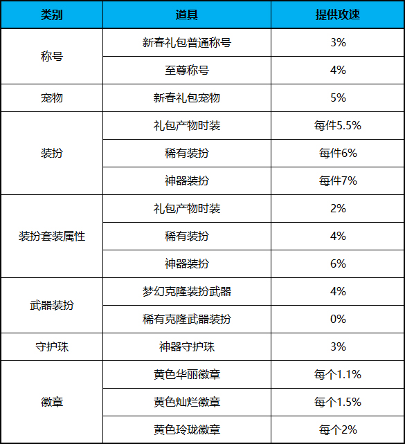 玩家较为容易达到的细节打造部分攻速加成为:称号3%+宠物5%+装扮12%+装扮套装4%+武器装扮4%+守护珠3%+徽章4.4% =35.4%,而打造较好的玩家能够达到50%。