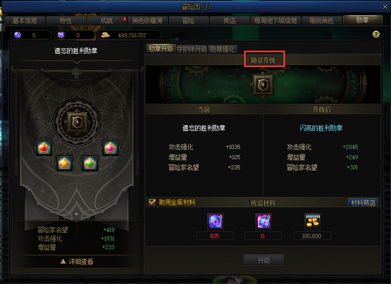 在冒险团勋章系统或代号:盖波加特殊频道NPC机械七战神库里欧处可进行勋章/守护珠升级,升级需要能量核心、超导能量核心以及金币。能量核心、超导能量核心两种材料均由代号:盖波加副本产出。