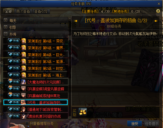 版本更新后,完成外传任务【代号:盖波加】即可通过专属频道进入副本。入场名望要求为31489,入场消耗疲劳30点;角色每周奖励次数1次,且账号内每周最多4个角色进入,入场及奖励次数每周4刷新。