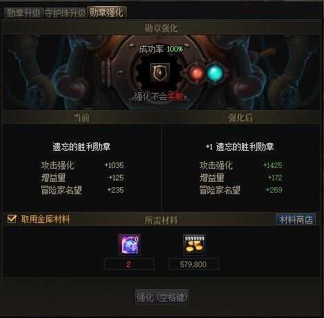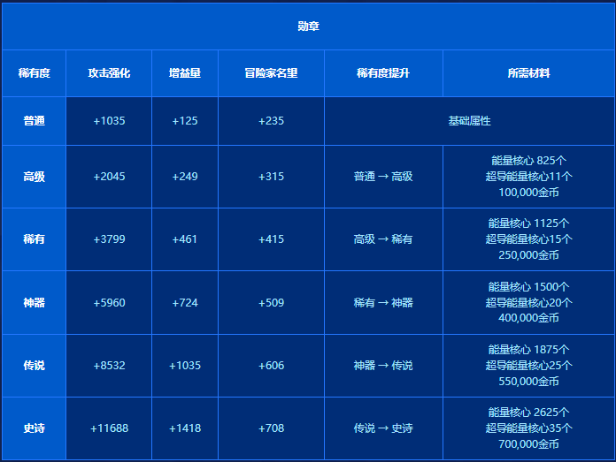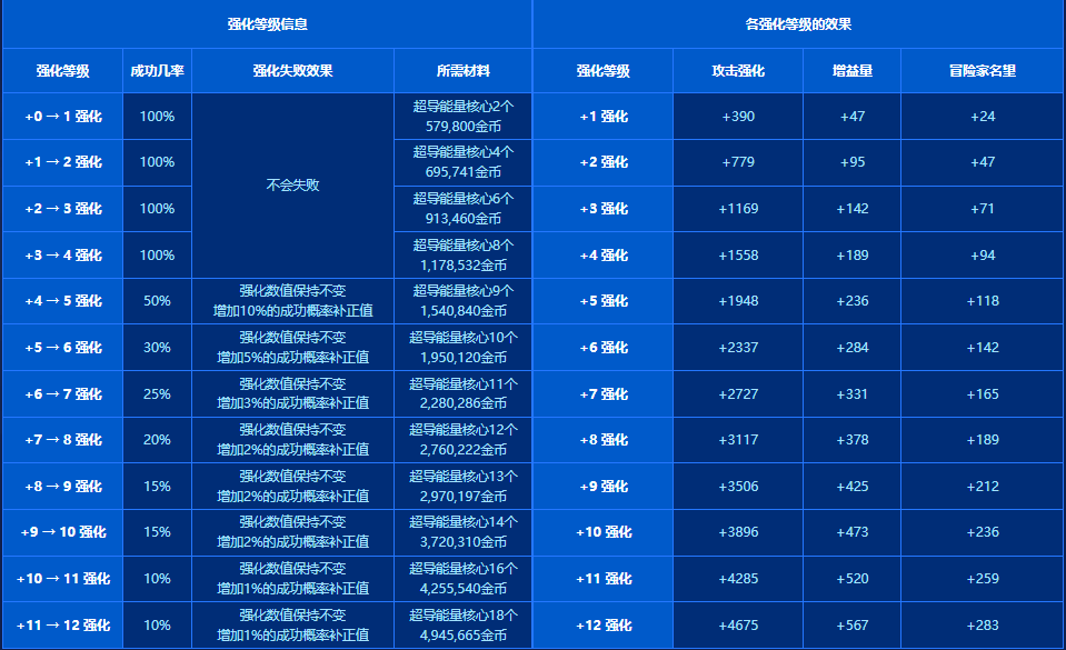 勋章强化需要超导能量核心以及金币,强化+1~+4期间成功率100%,最高可强化至+12,强化失败时强化数值保持不变。各强化阶段的属性及概率如下: