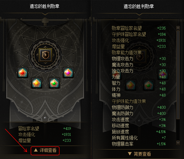 点击勋章下方【详细查看】即可查看当前勋章及守护珠的全部属性。