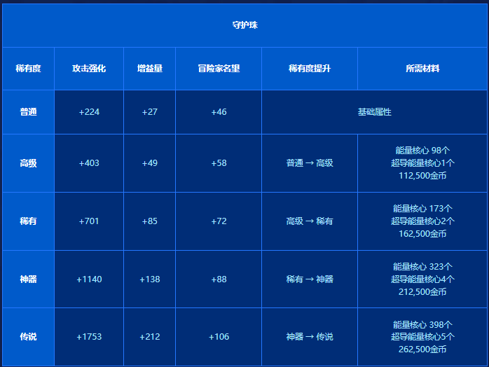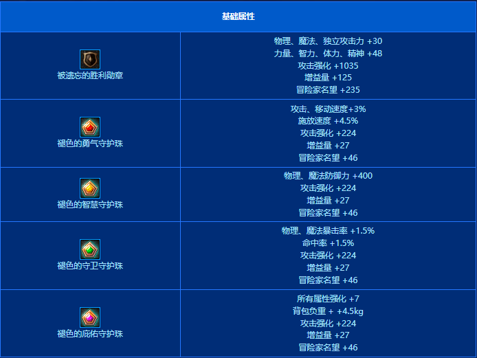 新版勋章及守护珠基础属性包含旧版勋章守护珠属性,小伙伴们无须担心原有攻速等属性缺失,且勋章升级后可获得额外攻击强化/增益量属性,勋章基础属性如下: