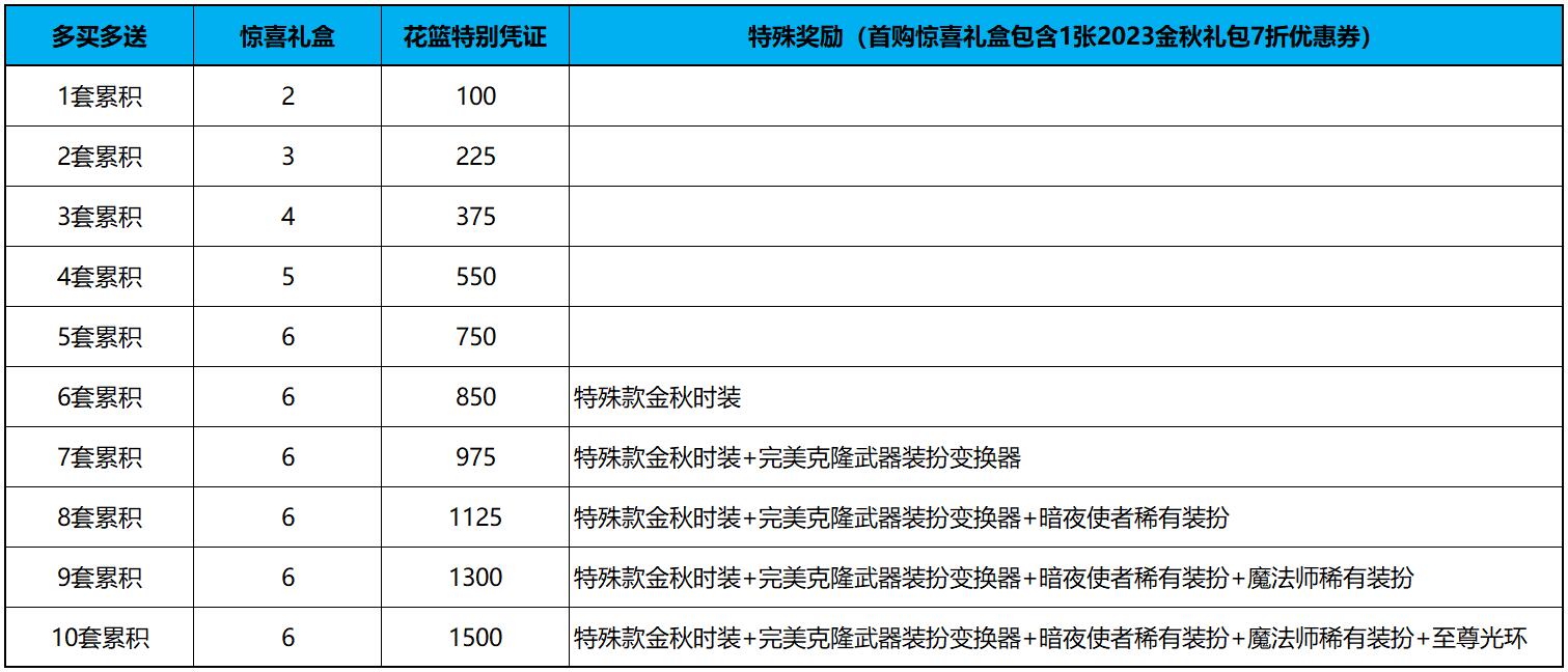 购买1~10套金秋幻梦蝶舞礼包会获得多买多送礼包,开启后可以获得金秋花篮特别凭证与金秋惊喜礼盒。从第10套礼包开始,每套都可获得100个金秋花篮特别凭证,可用此凭证在金秋专属商店NPC[金秋庆典花篮]处兑换[特别]页签中的奖励。
