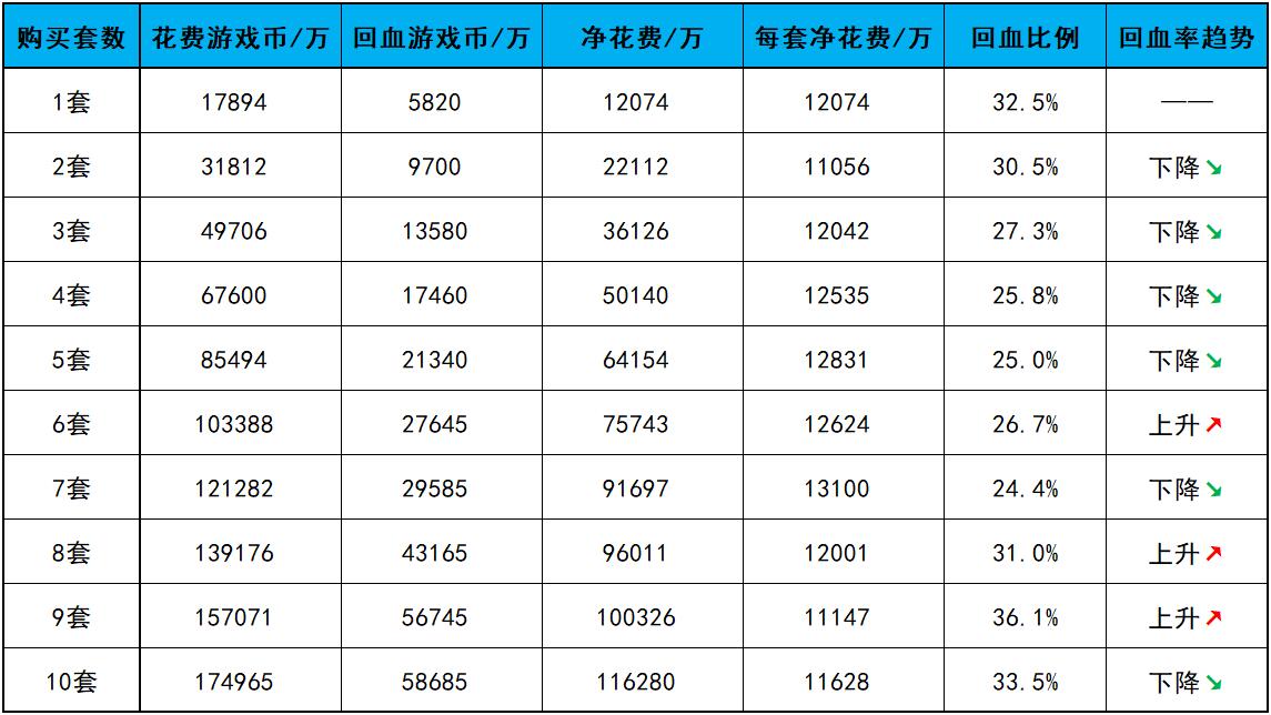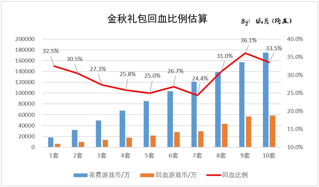 参考往年跨五金秋产物的价格情况,笔者估计今年金秋包的回血率大约为30%,根据购买套数的不同回血率有波动,预估购买9套时回血率最高。