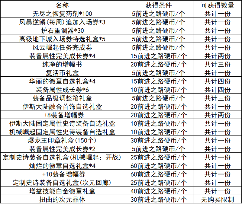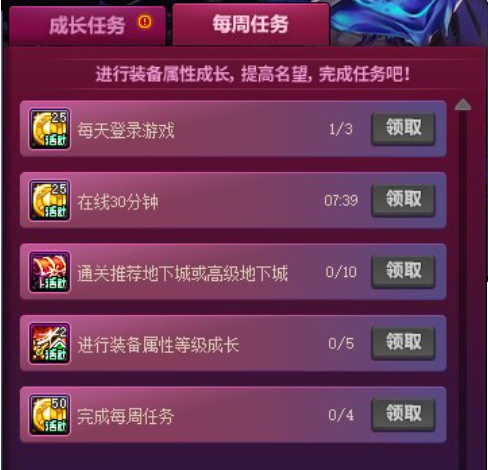 每周任务当中通过登录游戏、通关推荐地下城、进行装备属性成长等操作即可获得成长支援奖励、成长之路硬币、装备属性完美成长券等奖励,前进之路硬币可以在前进之路商店当中兑换奖励。