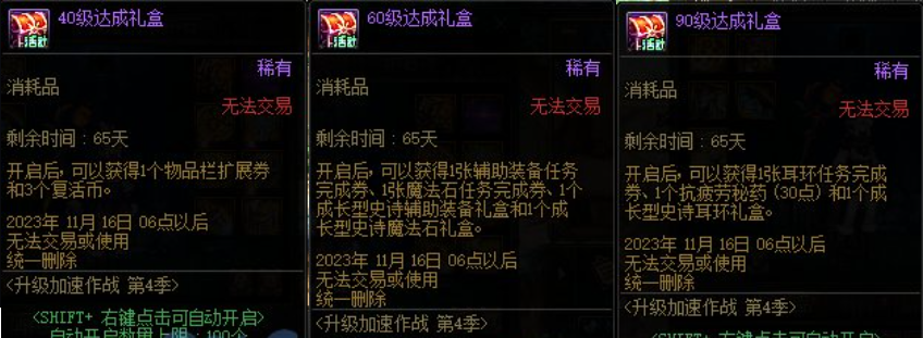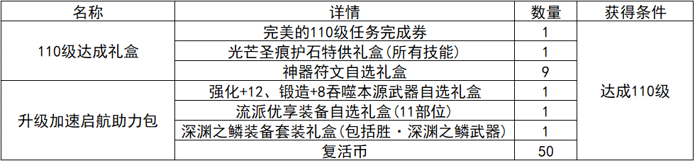 角色在升级途中到达一定的等级阶段时可以获得升级礼盒,多为复活币、恢复药剂、任务完成券等奖励。不过直接指定110级角色小伙伴不用担心,被指定之后可以直接在邮箱当中领取过往等级所有的等级礼盒,其中包含110级达成礼盒。