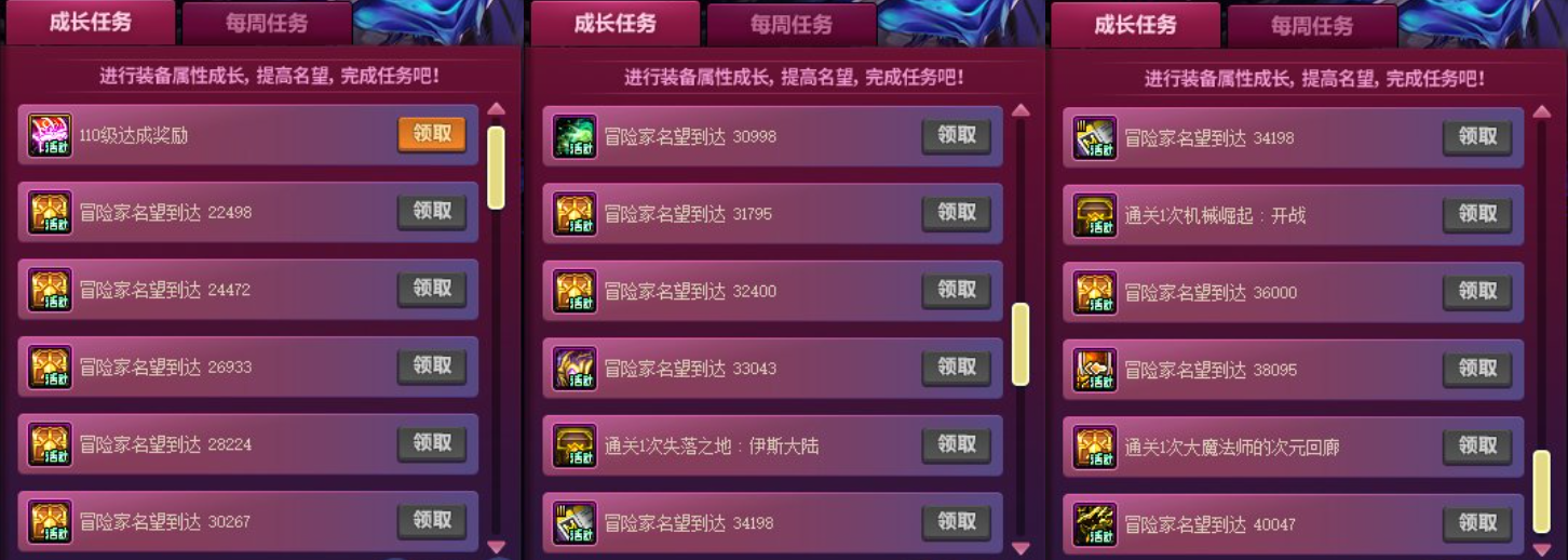 角色到达110级之后,可以在活动界面查看成长任务与每周任务。成长任务为里程碑式奖励,当名望值达到一定数值的时候可以获得名望值达成礼盒,其中包含高词条等级史诗装备、装备属性成长券等奖励,帮助勇士们快速提升装备词条。