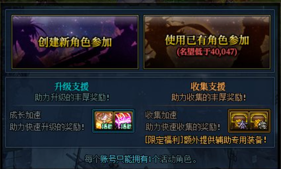版本更新之后登陆游戏在角色选择界面即可看到活动提示框,勇士们可以在提示框处便捷创建或者指定活动角色。创建的角色初始等级为1级,可以通过活动副本的形式快速达成110级。使用已有角色的话可以直接指定110级的角色,不过名望值限定在40047以下,每个账号只能拥有一个活动角色,且指定之后不可以更换。