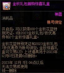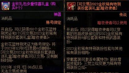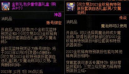 多买多送中购买8套可以获得可交易的暗夜使者[2023金秋特别装扮套装礼盒],购买9套可以获得可交易的男/女魔法师[2023金秋特别装扮套装礼盒],去年金秋礼包在售期间跨五2022金秋特别装扮套装礼盒的价格约为12000万金币。