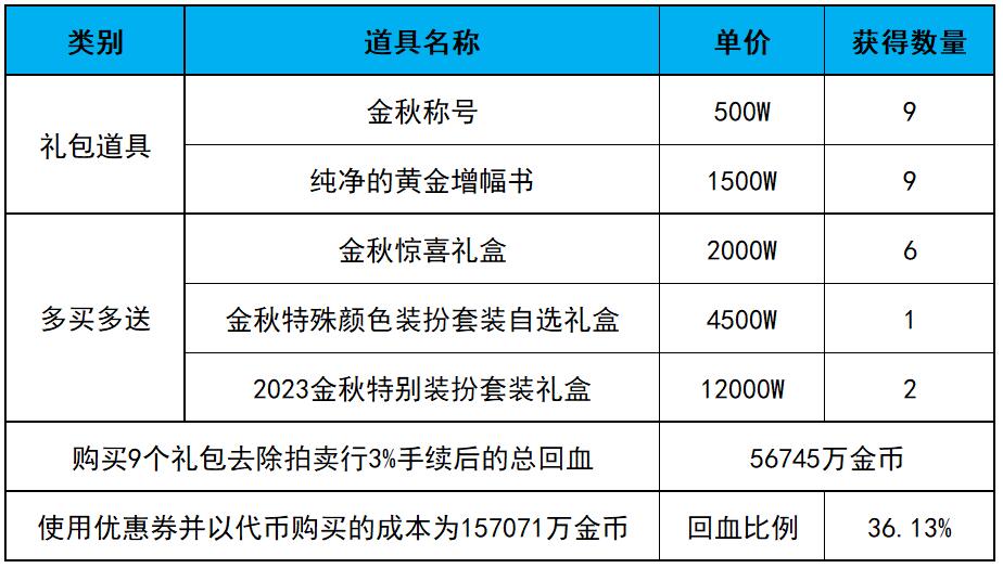 笔者结合跨五拍卖行相关道具售价与去年金秋礼包产物的价格情况,对今年金秋礼包的回血率进行了简单的估算。