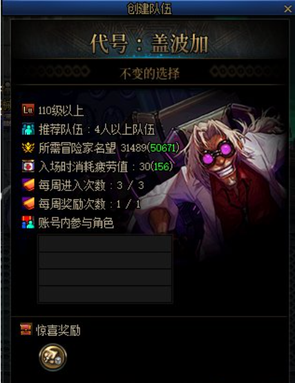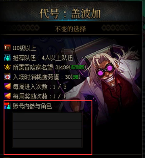 每周每账号只能有四位角色参与副本,角色入场时,当前角色将与地下城绑定,绑定关系与副本奖励均于每周四凌晨06点刷新。当账号内绑定角色达到4个时,其余角色将无法继续进入地下城。