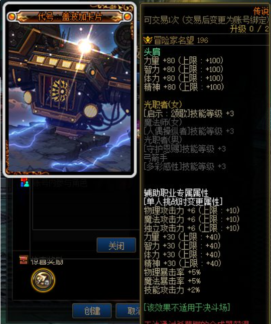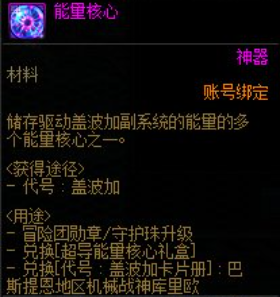 所有阶段的难度中都会有一定概率产出代号 : 盖波加卡片,为头肩部位的附魔卡片,属性为四维+100、15级被动技能等级+3。