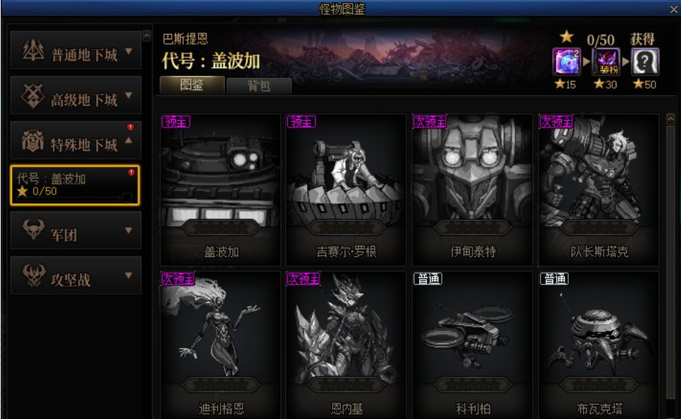 怪物图鉴新增特殊地下城栏,其中包含代号:盖波加副本。当图鉴积累进度到达15、30、50时分别可以获得超导能量核心*2、恩内基大头装扮礼盒、超能爆弹变身道具。