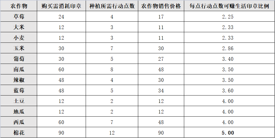 A:种植完成每日任务与访客委托任务(任务有时候需要提供农作物)所需的农作物后,剩下的行动点数可体验钓鱼或种植心仪农作物,然后卖出获取生活印章。如果想获取尽可能多的金币,可以按下图赚取比例种植农作物。