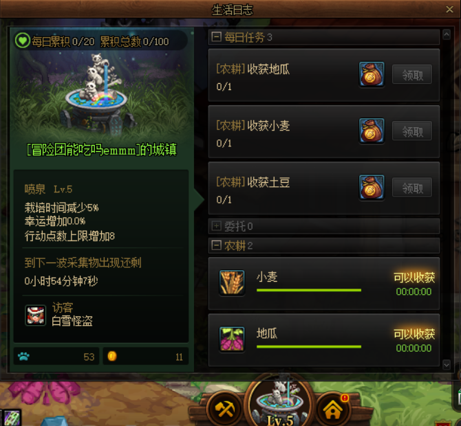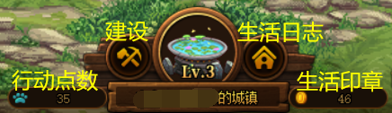 A:蓝色小爪子为行动点数,用于钓鱼、种菜等;建设图标用于建设、布置家园;生活日志可查看当前农作物剩余栽培时间、每日任务完成进度、今日访客、喷泉buff、下一波采集物出现时间、行动点数与生活印章数量等信息;生活印章用于在家园npc处购买道具、建筑扩建、移除闪亮水晶堆等。
