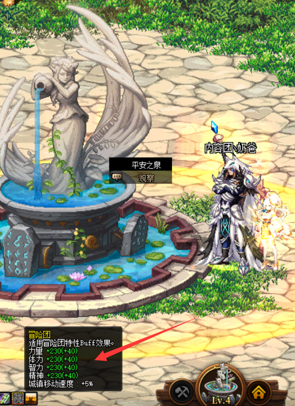 A:通过Npc【坦博】进入交流地区,往走左找到平安之泉,靠近即可获得一个持续1小时的冒险团增益buff。冒险团等级在30级以下时,获得一个冒险团30级的适用buff(冒险团四维加至270)与城镇移速+5%;冒险团为30级及以上时,获得一个四维+20、城镇移速+5%的冒险团buff。