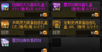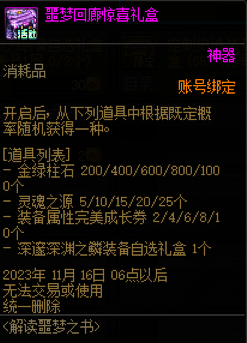 噩梦回廊惊喜礼盒里面有金绿柱石、灵魂之源、完美成长券和深邃深渊之鳞装备自选礼盒。